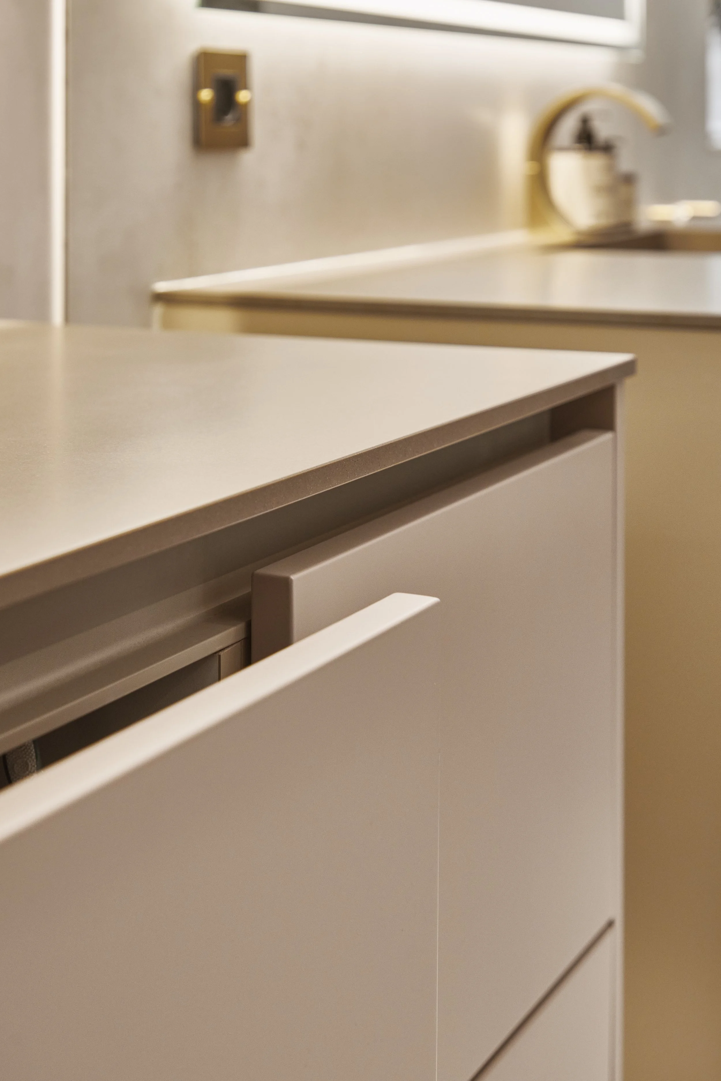 De specialmalede fronter fremstår med en blød, mat overflade, hvor lyset bevæger sig stille hen over fladerne og fremhæver nuancernes varme. Bordpladen i specialfarvet Corian vidner om en kompromisløs tilgang til detaljen.